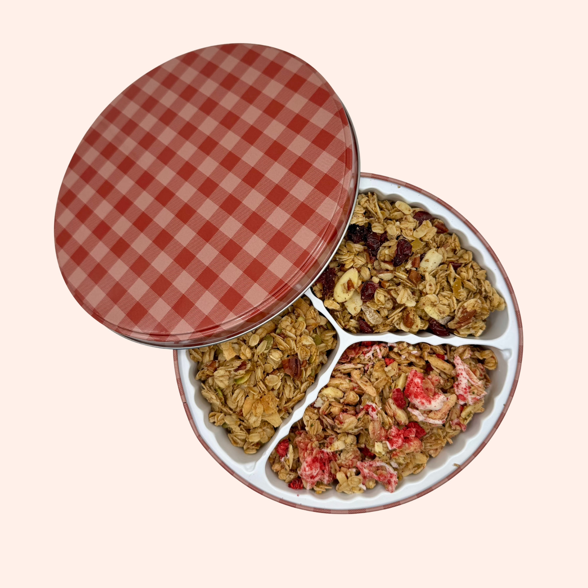 Sled over popcorn, granola is jingling all the way into the holidays as your new snack obsession. Our holiday tin is split into three merry & bright sections, each filled with a different Granola Girl flavor for joyful snacking all season long.